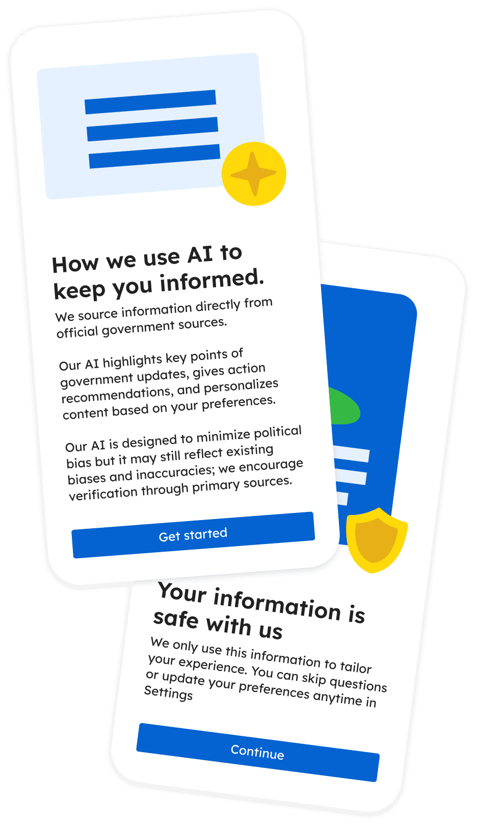 People liked the progressive disclosure and the actionable steps that made policy feel less overwhelming. At the same time, they flagged places that needed more clarity—like text hierarchy, question wording, and making clickable items obvious. Concerns about AI bias and how info is verified highlighted that the product needs more transparency features.